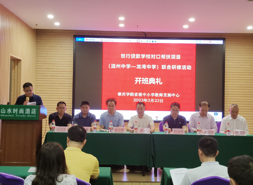 3月23日下午,省教育厅世行贷款学校对口帮扶项目(泷州中学-龙湾中学) 联合研修班在肇庆山水酒店7楼会议室如期举行开班典礼。taptap点点官方网站taptap点点官方网站副院长曾毅教授、罗定市教师发展中心教研部黎汉俊主任、泷州中学及龙湾中学校领导与老师出席了开班仪式。