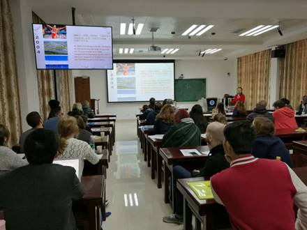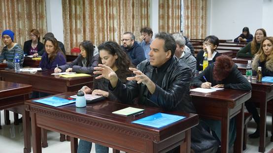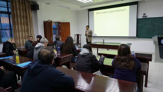 26日上午,来自广州市南海中学的英语高级教师吴才斌老师为学员们开设了《中小学课堂的英语教法》专题课。吴老师结合自身一线教学经验和当下中学生语言学习的特点,向这批外籍教师们展示了国内中学课堂的英语教学情况,并用很多启发式问题激起学员们对英语学习问题进行思考和讨论。