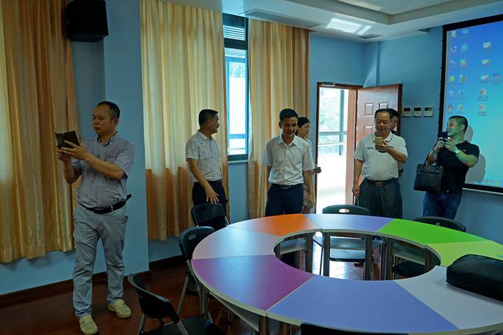 2017年6月29日下午,汕头市潮南区教育局领导一行六人来到taptap点点官方网站省级中小学教师发展中心,在我中心培训部肖晓玛主任、黄燕芬老师、王子瑫老师的陪同下,参观了书画训练室、普通话测试室、远程教学交互中心、教学新媒体实训室、教学设计与教学反思室、智慧教室、团体辅导室、教师形象设计室、微课制作室等各个功能室。客人们对我中心的整体设计及先进硬件设备给予了充分肯定和赞扬。