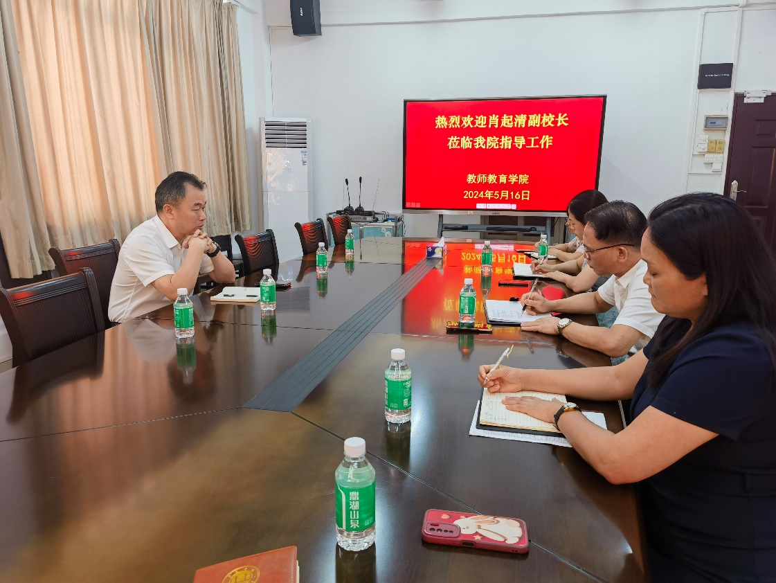 肖起清听取了学院领导本学期以来开展的工作梳理汇报,对学院的各项工作给予了肯定,并就学院下一步的发展提出指导意见,要求学院认真落实“一岗双责”,提高政治站位,开展好党纪学习教育,继续优化实习基地建设,抓好实习管理工作,丰富教师教育学科内涵,打造好“砚园班”品牌,擦亮北师大华南分中心品牌,落实好“三所学校”工作方案,力争在教学科研等工作中取得新成绩。