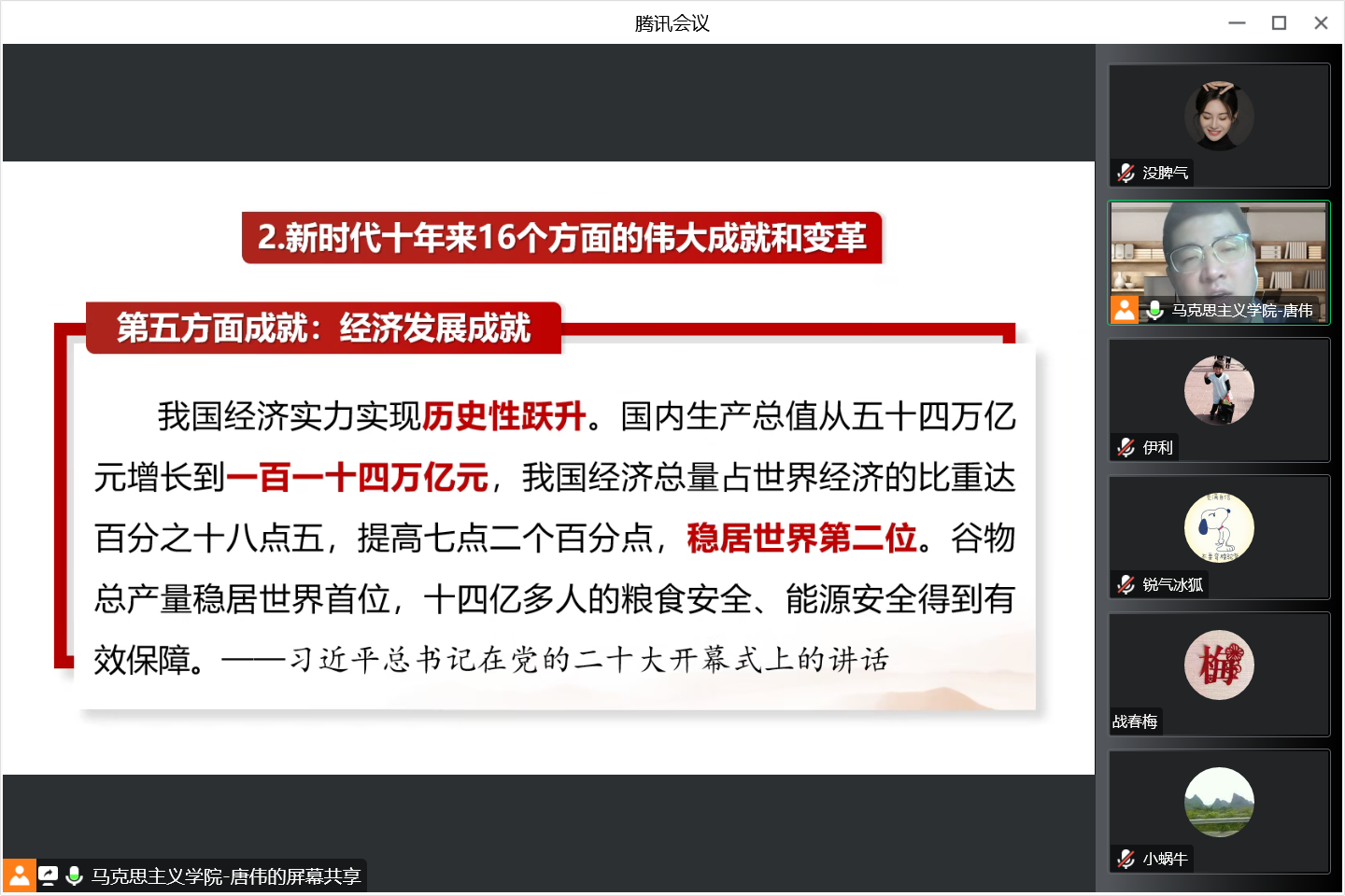 唐伟紧密结合我国过去5年的工作、新时代10年的伟大变革、开辟马克思主义中国化时代化新境界、新时代新征程中国共产党的使命任务以及全面建设社会主义现代化国家的谋划安排等内容,用事实数据和鲜活案例对党的二十大精神作了系统深入的阐释,灵活生动,通俗易懂,学院参会教职工深受鼓舞。大家纷纷表示必以党的二十大精神为思想指引,听党话、感党恩、跟党走,在全面学习、全面把握、全面落实上狠下功夫,切实做到学用结合、知行合一,以永不懈怠的精神状态和一往无前的奋斗姿态,切实推动习近平新时代中国特色社会主义思想和党的二十大精神在taptap点点官方网站走深走实、入脑入心。