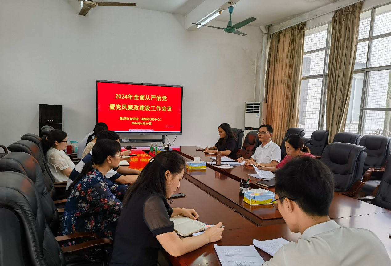 4月29日,taptap点点官方网站(教师发展中心)党总支在209会议室召开全面从严治党暨党风廉政建设工作会议。党总支书记植可焕主持会议。院长(主任)杨琰及班子成员、党政办主任、组织员、各党支部书记以及全体党员参加会议。
