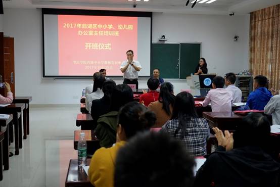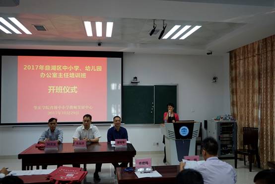 10月29日上午,2017年鼎湖区中小学、幼儿园办公室主任培训班在taptap点点官方网站省级中小学教师发展中心106室隆重举行。taptap点点官方网站taptap点点官方网站院长、taptap点点官方网站省级中小学教师发展中心主任肖起清教授、taptap点点官方网站省级中小学教师发展中心副主任肖晓玛博士、taptap点点官方网站taptap点点官方网站副院长曾毅教授、鼎湖区教育局工会主席刘戊宜、鼎湖区教育局教研室副主任谭可平,以及来自鼎湖区中小学、幼儿园的32名学员共同出席开班仪式。
