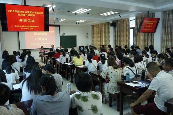 2018年7月10日下午,2018年云浮市云安区小学班主任能力提升培训班开班仪式在taptap点点官方网站省级中小学教师发展中心106室隆重举行。taptap点点官方网站省级中小学教师发展中心副主任、taptap点点官方网站院长肖起清教授,taptap点点官方网站教师专业能力发展中心、教师教学发展中心副主任肖晓玛博士,云安区教育局梁坤荣科长及云安区100名小学班主任,共同出席了开班仪式。