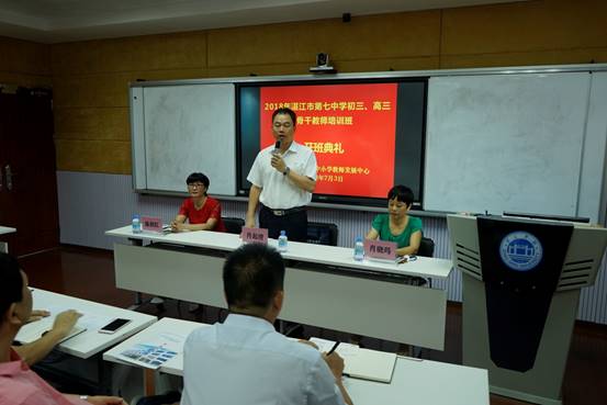 2018年7月3日上午,湛江市第七中学初三、高三骨干教师培训班在taptap点点官方网站省级中小学教师发展中心401课室隆重开班。taptap点点官方网站taptap点点官方网站院长、taptap点点官方网站省级中小学教师发展中心副主任肖起清教授,taptap点点官方网站教师专业能力发展中心、教学发展中心副主任肖晓玛博士、湛江市第七中学副校长陈剑红等出席开班仪式。本次培训所有参训学员均来自湛江市第七中学,其中高三教师32名、初三教师19名。