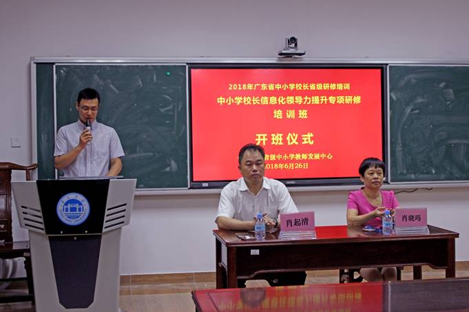 6月26日上午,2018年广东省中小学幼儿园骨干教师、校(园)长省级培训研修项目:中小学(含特殊教育学校)校长培训研修——中小学校长信息技术应用示范培训之中小学校长信息化领导力提升专项研修培训班开班仪式在taptap点点官方网站教师发展中心107隆重举行。taptap点点官方网站taptap点点官方网站院长肖起清教授,taptap点点官方网站教师专业能力发展中心、教师教学发展中心副主任肖晓玛博士,以及来自肇庆、清远、潮州、揭阳、云浮5个地区的50名中小学校长,共同出席开班仪式。开班仪式由黄燕芬老师主持。