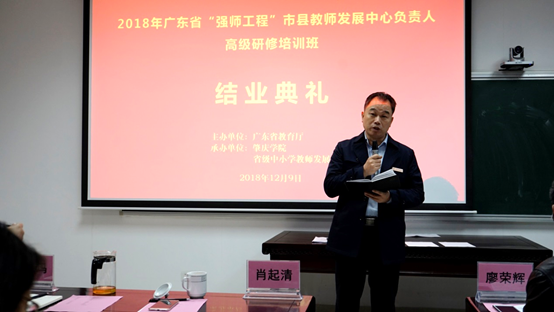 最后,廖荣辉主任发表重要讲话。廖主任高度肯定了此次培训的成效:课程安排合理,师资力量雄厚,学员学习认真。廖主任对市县教师发展中心建设工作做了重要部署,着重强调以下几点:1、逐步推进、因地制宜,机构整合不强求统一模式,在建设过程中多进行专题论证,积极推动建设工作。2、理清思路、完善方案、优化资源整合。3、敢于担当,在省厅推动下,学会助推自身,且借力其他机构与部门的资源,争取2019年8月,顺利通过绩效考核。4、加强质量监控,在培训项目开展过程中,切记不要选择“无证件、无场地、无食宿的三无机构”作为培训项目实施机构。5、努力做到几个新目标:健全培训体系;培育省市县三级体系的名师、名校长工作室主持人、展开五年360学时精准培训、培育专业发展学校;拟定分科分类课程指南;展开培训“新管理”、建设信息化管理平台;设置培训指南与项目指南;引入第三方,对所有培训项目进行现场抽查,展开“新评估”。